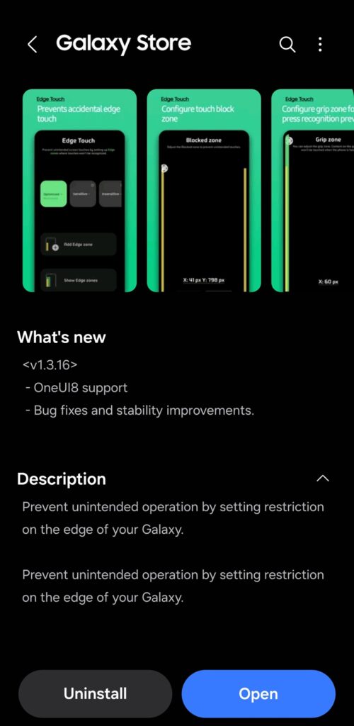 Edge Touch’s new update comes with version 1.3.16, introducing One UI 8 support. Samsung also claims bug fixes and stability improvements, so users enjoy a seamless experience when setting up “edge zones.” For the uninitiated, this Good Lock module lets you specify edge zones to prevent unintended screen touches. The device doesn’t recognize touches in the specified zones.