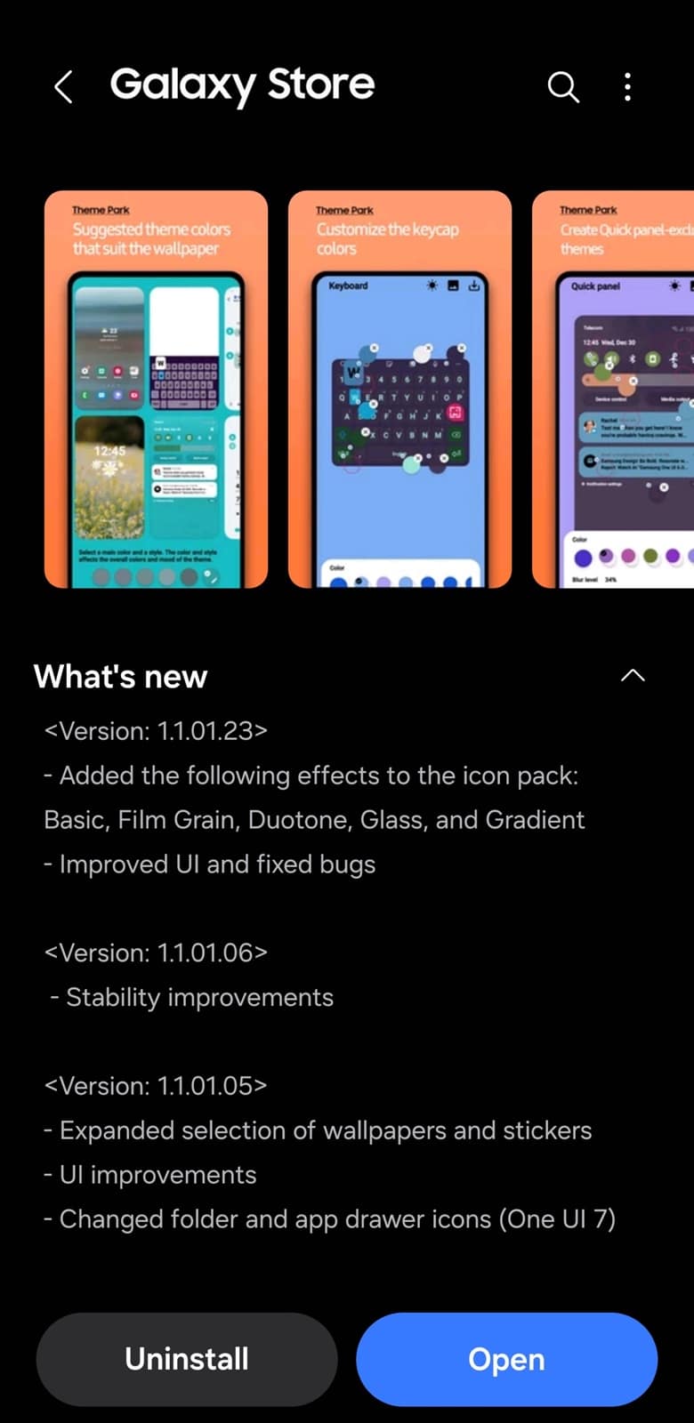 The latest update for Theme Park (version 1.1.01.23) introduces a slightly refreshed user interface and minor bug fixes for a smoother customization experience. More notably, Samsung has added five new effects for icons: Basic, Film Grain, Duotone, Glass, and Gradient (thanks, @theordysm). These effects allow users to give their custom app icons a fresh look, from subtle textures to bold color changes and translucent glass-like finishes.