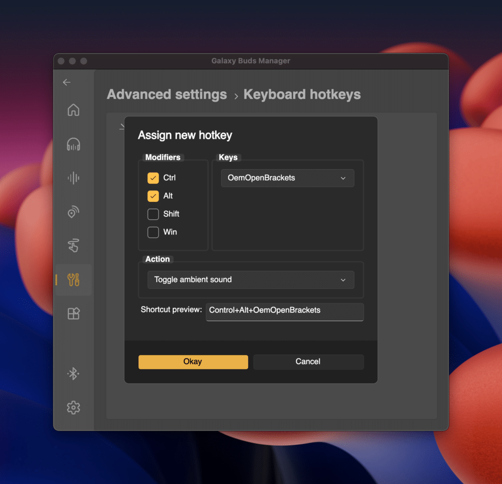 If you enter the Advanced settings, and find Keyboard Hotkeys, you can create custom macros that can control your buds. For example, I’ve made Control + Option + [ to toggle transparency mode, and Control + Option + ] to toggle noise cancelling. Perfect for power users.