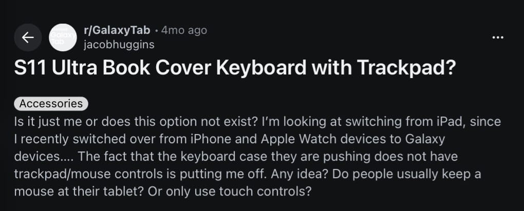 Heading over to Reddit, we can see one user’s potential migration from Apple to Samsung has halted because there isn’t a keyboard with a touchpad available. Another isn’t satisfied with the current Book Cover Keyboard Slim and believes Samsung has forgotten about the Pro Keyboard.