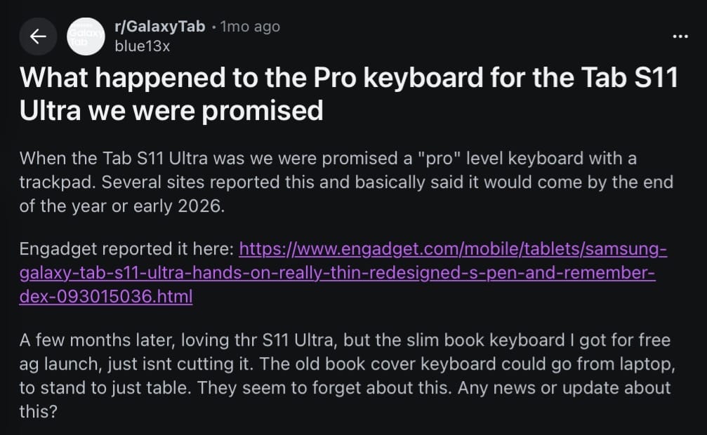 It’s been a few months since Samsung unveiled the Galaxy Tab S11 series at its Unpacked event in September 2025. At that time, the company also announced the Pro Keyboard case for the new tablets. However, there’s no sign of it yet — not a single word, not even a hint. As time drags on, the absence of the Pro Keyboard is becoming increasingly frustrating for Galaxy Tab S11 owners like myself.